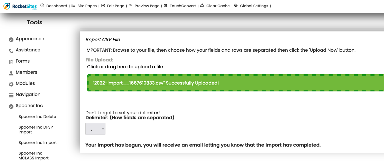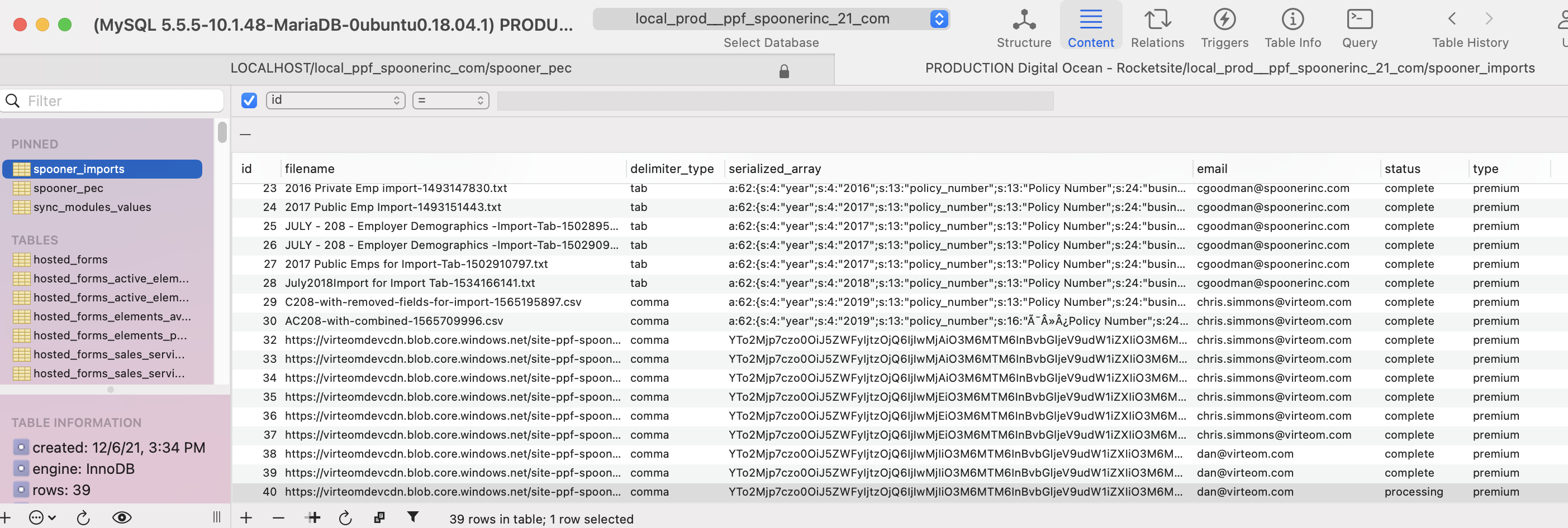 Let's go to spooner_imports table first. If you look at the last record you should see your file "processing" it may even say "complete" if it says "processing" change it to say complete for now.