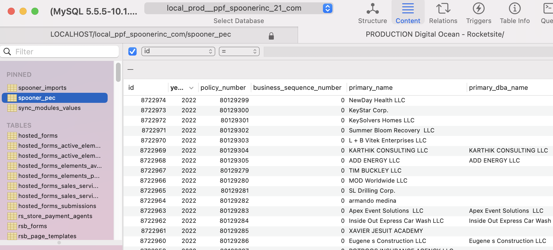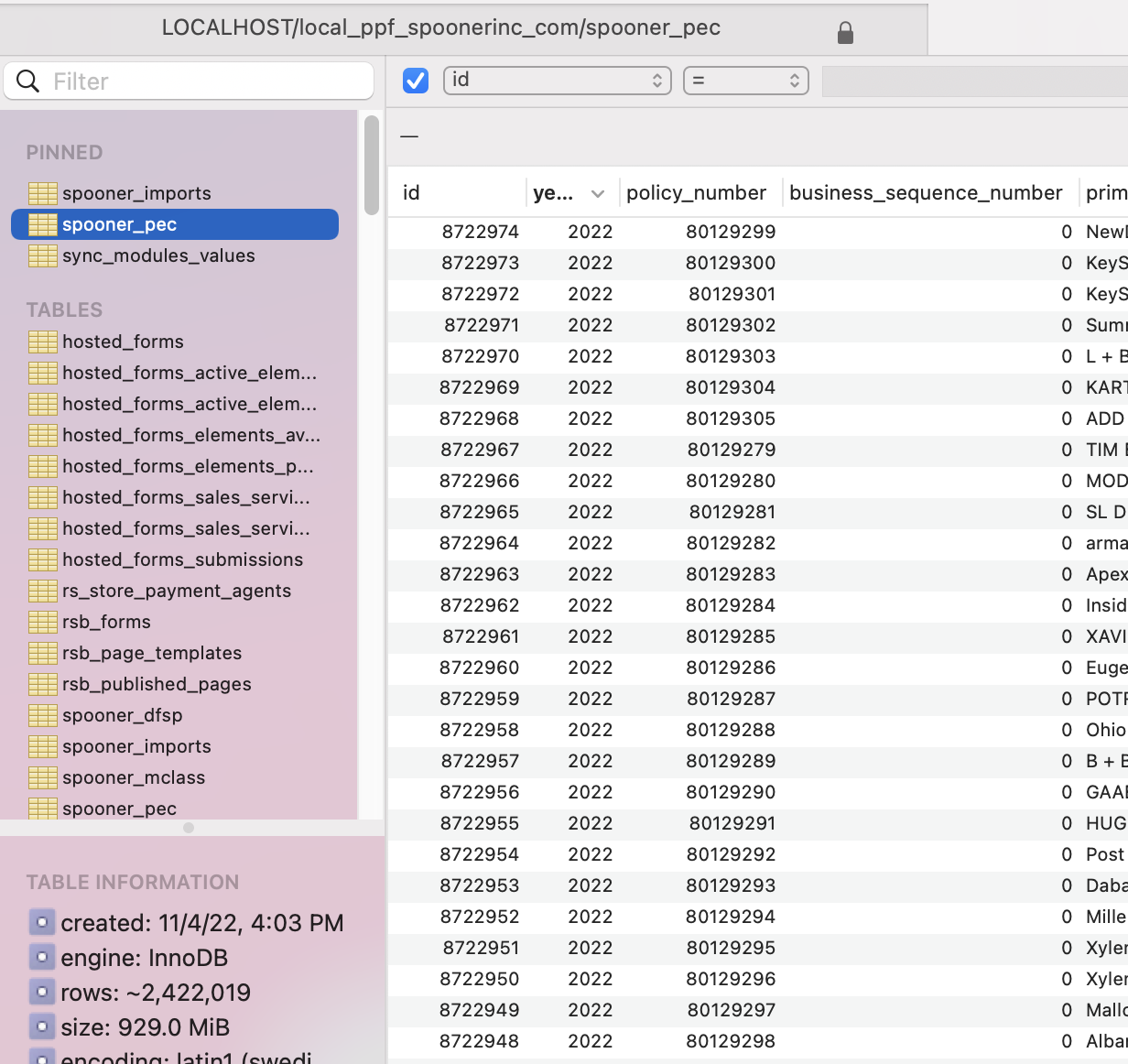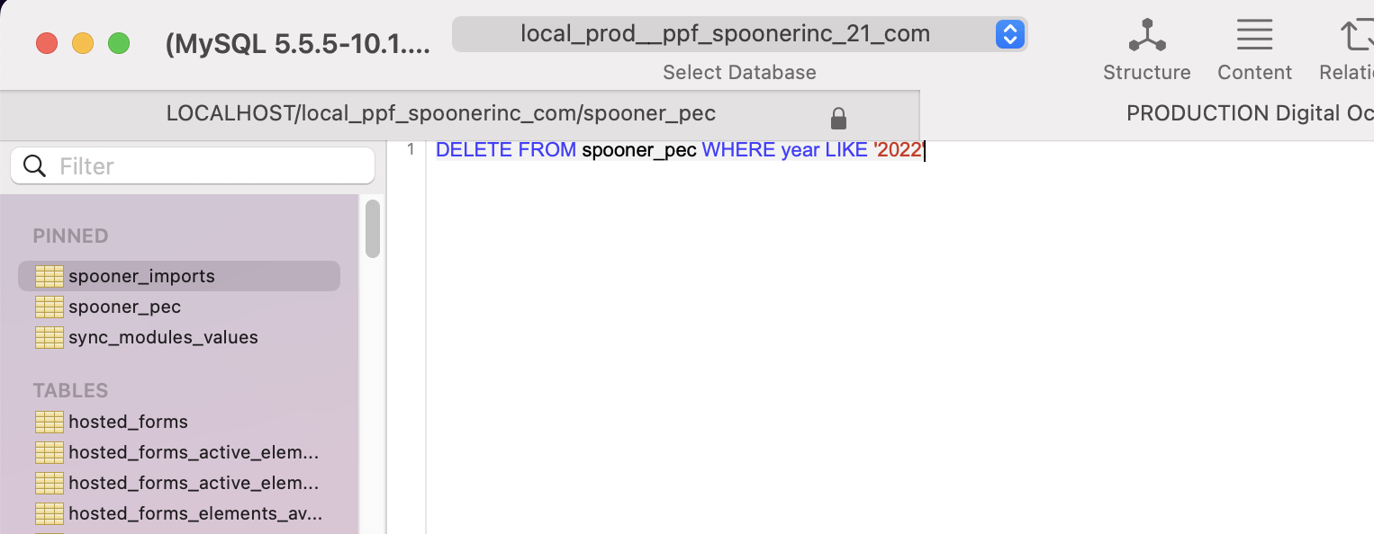 We're actually ready to import now. Before we do. Go ahead and go to the spooner_pec table and sort by year with latest year DESC so you can make sure your year isn't in there just yet. See screenshot below for example. After running the delete statement above, I should not see my year below. In the example below I am demostrating that the year is still in there.. But it should not be.. Once it's not we are ready.