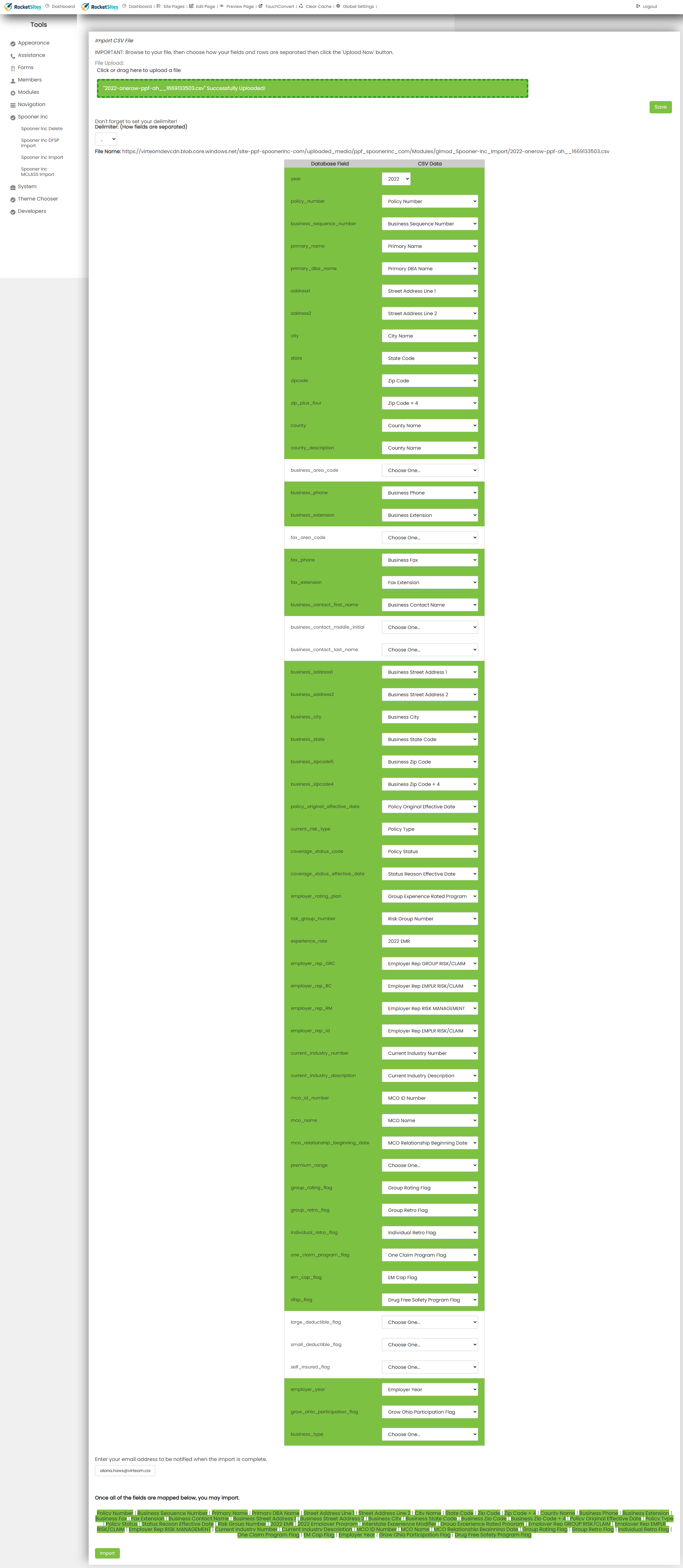 Datamapping is simply matching the columns in your excel spreadsheet with the columns in the database. As of 2022, the below map represents the datamap that worked for importing. The labels that have square brackets around them are the database column names, example [policy_number] is the name of the database column and => Policy Number is the column name in my spreadsheet. Use the below to remove any columns that aren't needed to match up to this. That should make it simple. In short... If you have more column names in the CMS than the ones in your spreadsheet, remove them from the excel spreadsheet. If, once you map, the bottom area has white entries (not all green) the import will not work. If you see "Choose One" that means you don't have a column for it and leave it blank.