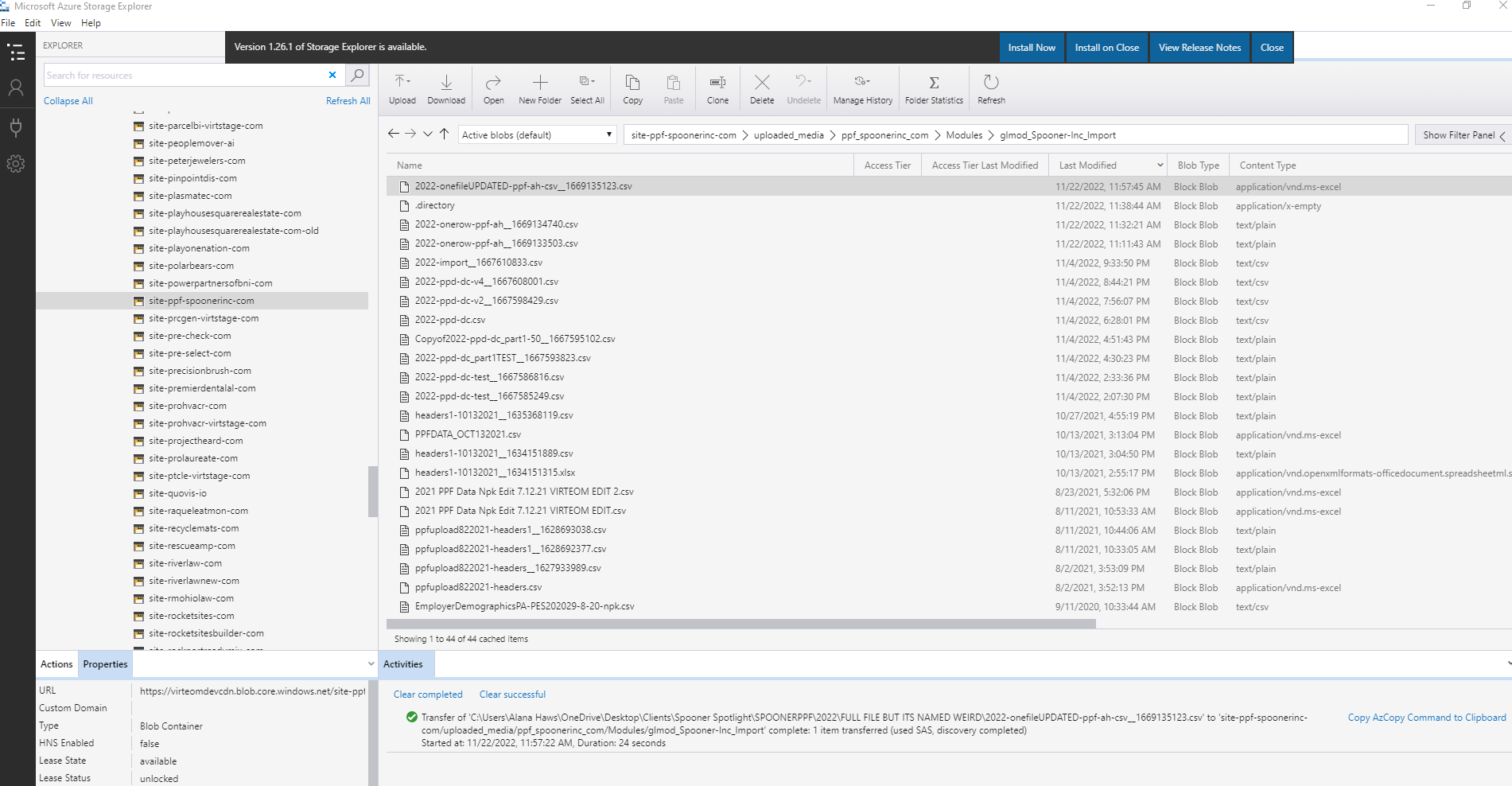 Open Azure file explorer and navigate to the file that was just uploaded and replace it with the full data file and MAKE SURE you are overwriting the single record file with the full records file and name it exactly as it is above in the green box. To get the file location you can click on the file name in the green box and it will tell you it's exact location.