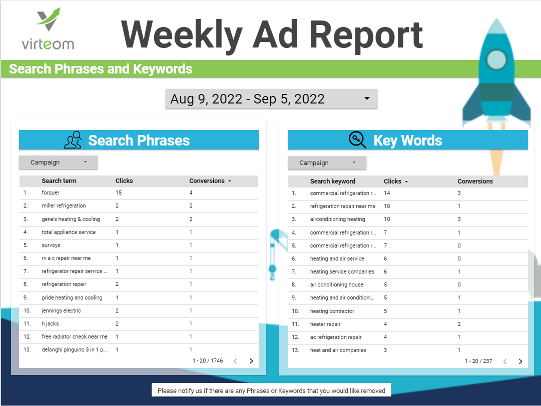 Once we setup your Ad Report, it will be emailed out to you weekly on either a Monday, Wednesday, or Friday. If you would like a specific day of the week you can let us know through our tickets system: tickets@virteom.com