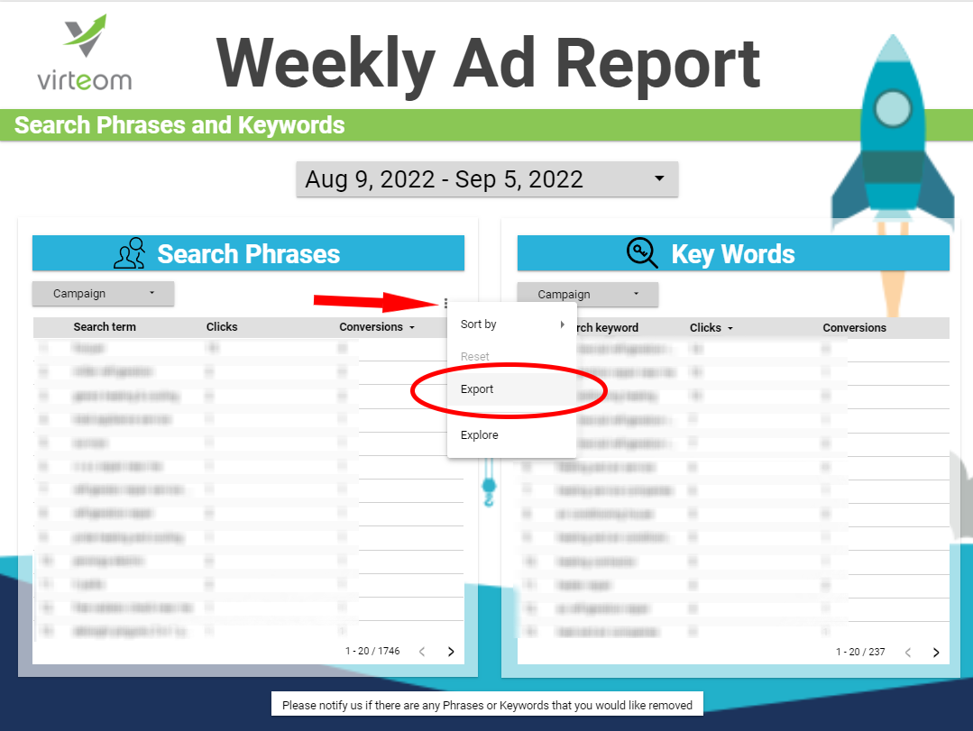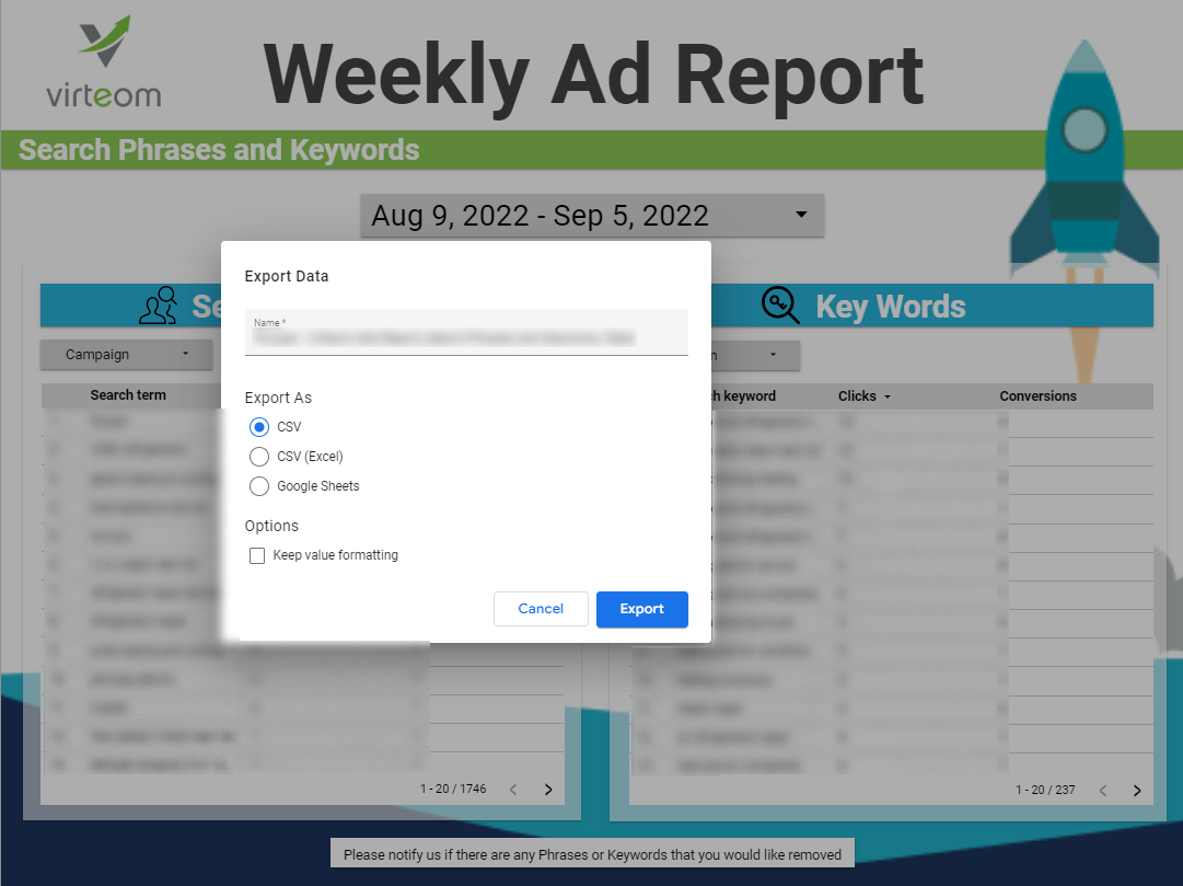 It is possible to export Search phrases and keywords to a CSV file. This may be necessary for ease of access to all Search phrases and Keywords that are used in Virteom's ads.