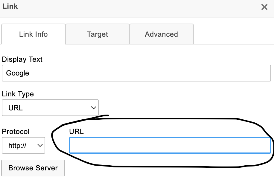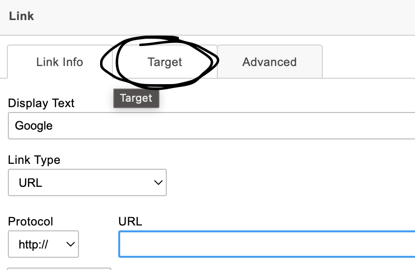 Once the link is pasted into the URL box, go ahead and click on Target: