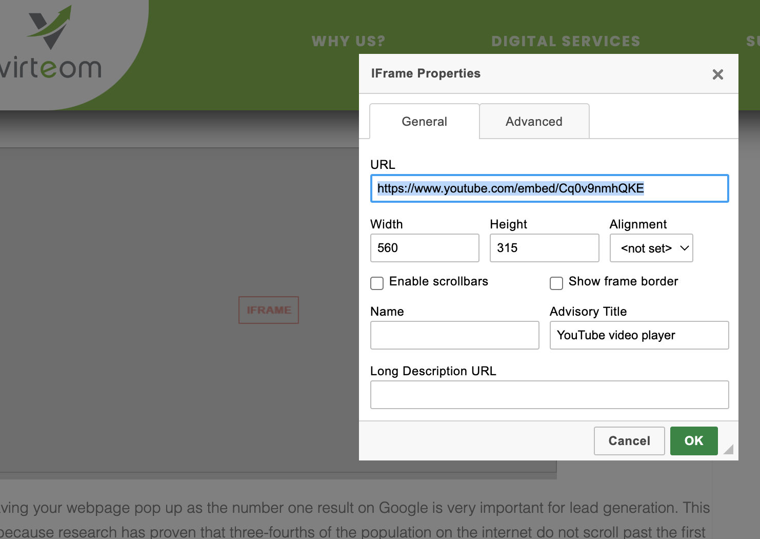For ALL client videos for RocketSites, you will make sure the Width is ALWAYS 99%, and the Height is 400