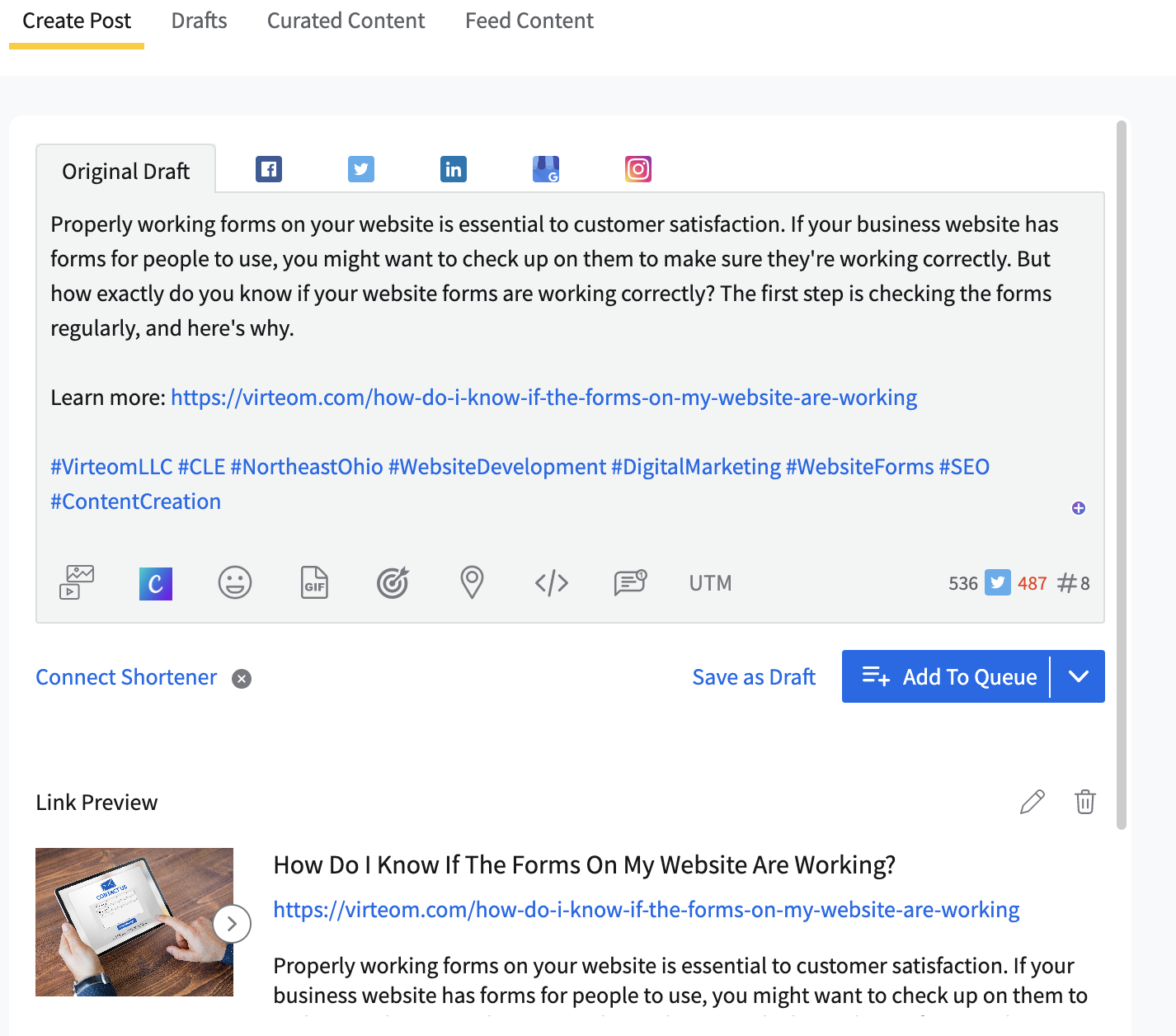 From this point, make sure the post is written to tailor to each platform. If they have twitter, edit the content to fit the character limit: